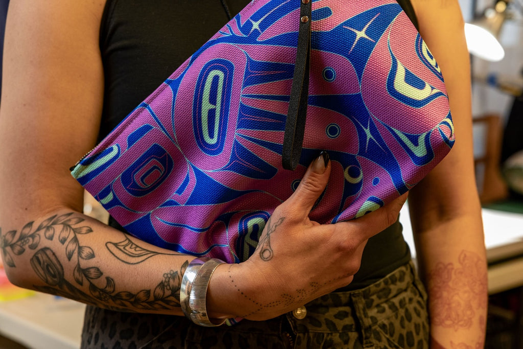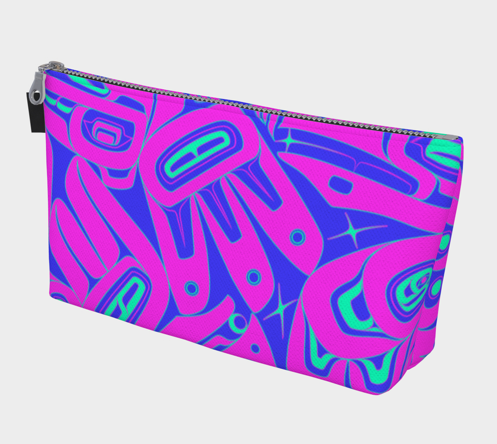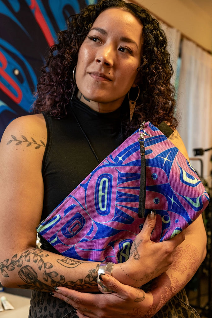 This new 2025 model stand-up bag was designed by Crystal Worl, co-founder of Trickster Company. It is 12-inch wide by 7-inch tall with a 4-inch base. It is crafted with a durable canvas exterior and a soft denim interior lining. Two large inner pockets organize all of your accessories. The bag is equipped with a nickel zipper and a black vegan leather zipper pull for added durability and style.