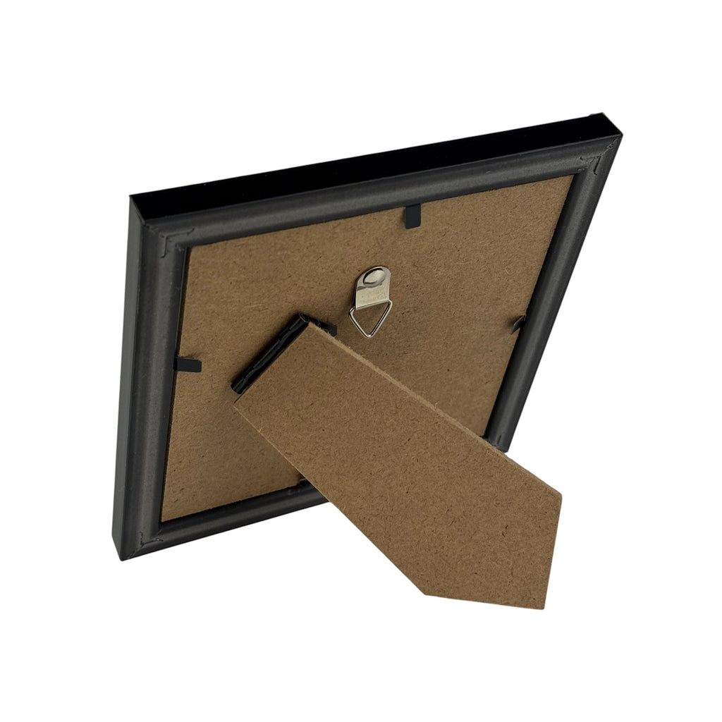 The print is enclosed in a black frame made of durable acrylic-resin (PS) molding construction. Comes with real glass covering the print. These frames can be hung on a wall or free standing on a flat surface.